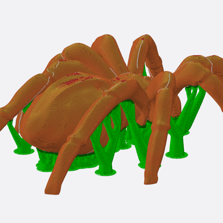 Stützstrukturen (im Bild Grün) im 3D-Druck sind Hilfskonstruktionen, die bei Überhängen (größer als 45°), Brücken und komplexen Formen